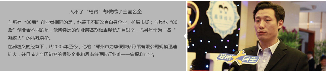 鄭州市力康假肢矯形器有限公司(簡稱力康),是一家專業(yè)從事假肢矯形器的設(shè)計(jì)、研發(fā)、制作及裝 配的專業(yè)機(jī)構(gòu)。成立于1992年是河南省唯一一家福利企業(yè)。力康下設(shè)業(yè)務(wù)部、技術(shù)部、住院部、康復(fù) 部、售后服務(wù)部,并配有現(xiàn)代化的裝配車間和功能齊全的訓(xùn)練大廳,為殘疾朋友康復(fù)訓(xùn)練提供了可靠 保障。總經(jīng)理穿戴假肢多年,有著豐富的臨床經(jīng)驗(yàn)和親身體會;多年來,力康已為全國幾十萬名殘疾 朋友安裝上舒適、美觀、耐用的假肢和矯形器具,使他們更大限度地恢復(fù)了正常的工作和生活。“產(chǎn) 品即人品”的質(zhì)量理念、先進(jìn)的技術(shù)、實(shí)惠的價(jià)格、完善的售后服務(wù)是力康取勝的法寶……